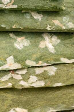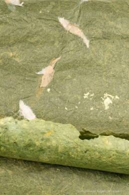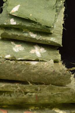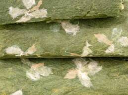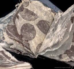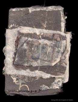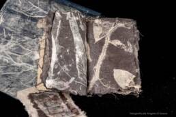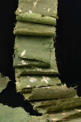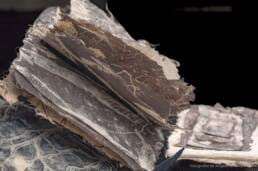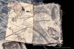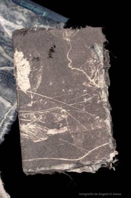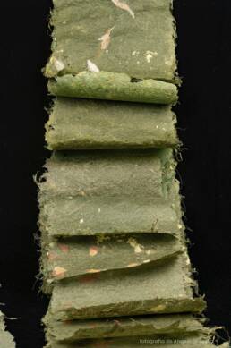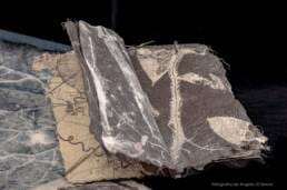 In this book, the artist works on handmade papers made from plant fibers, proposing an immersion into the pages, which become smaller as one approaches its interior. The images depict different life cycles of plants collected from her backyard, captured using the monotype technique. The print is obtained by removing the form that gave rise to it, leaving traces of its absence.*